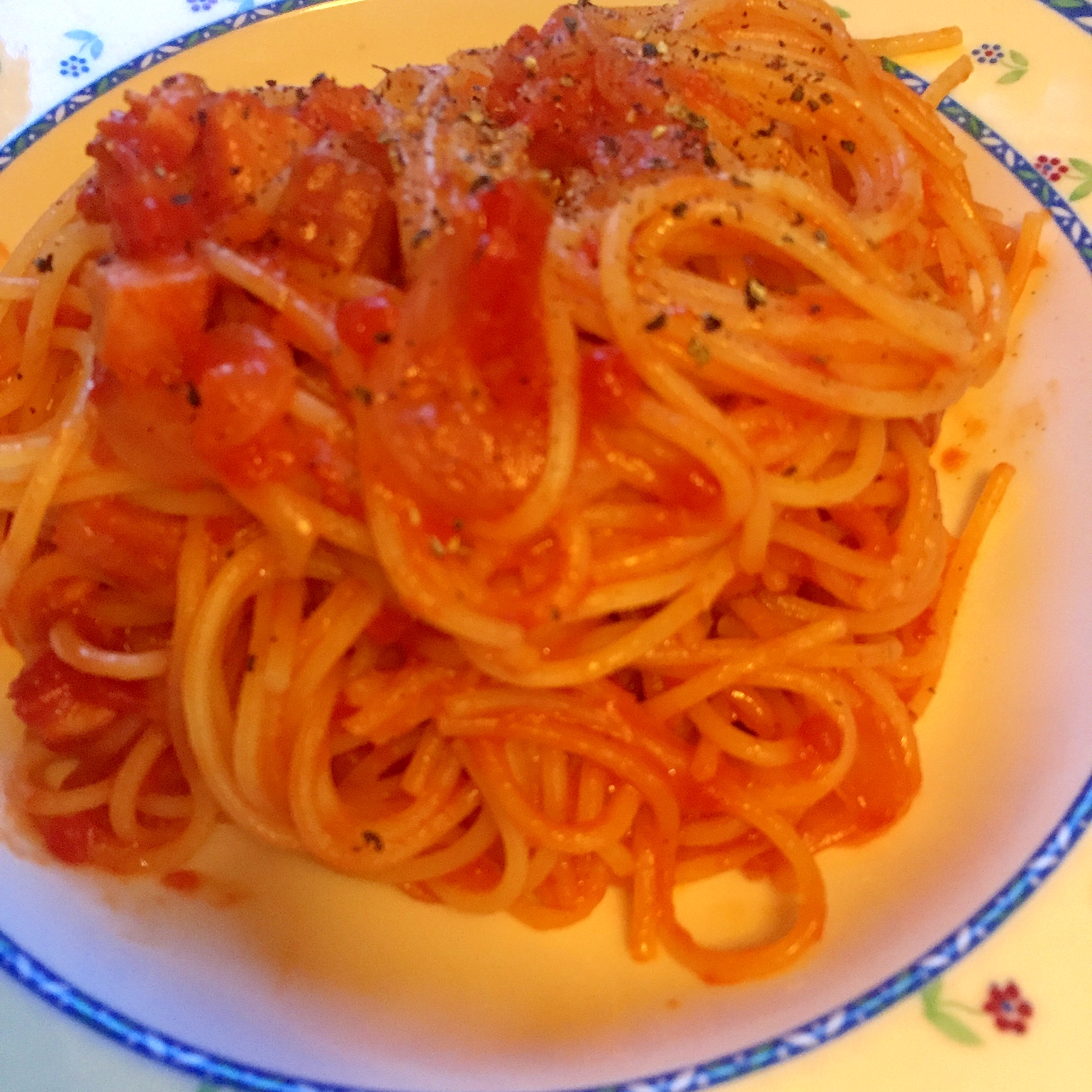 おうちでイタリアン トマト缶使用 玉ねぎなしのトマトソースパスタ